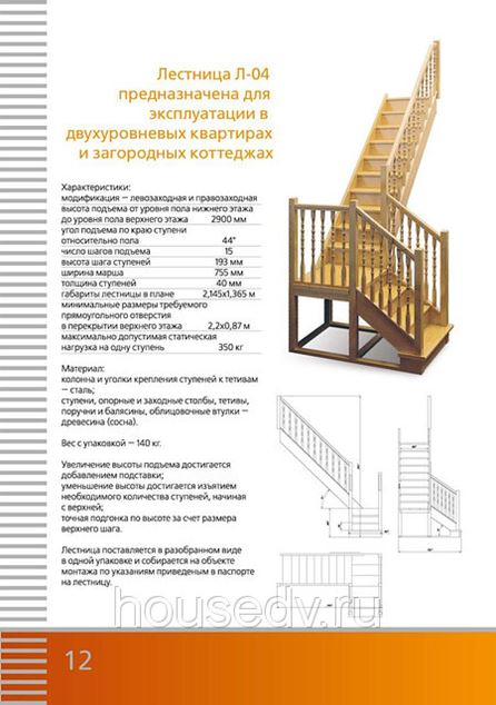 модификация левозаходная и правозаходная; высота подъёма от уровня пола нижнего этажа до уровня пола верхнего этажа 2800 мм угол подъёма по краю ступени относительно пола 44° число шагов подъёма 15 высота шага ступеней 193 мм ширина марша 755 мм толщина ступеней 40 мм габариты лестницы в плане 2,935х1,752 м минимальные размеры требуемого прямоугольного отверстия в перекрытии верхнего этажа 2,2х0,87 м максимально допустимая статическая нагрузка на одну ступень 350 кг