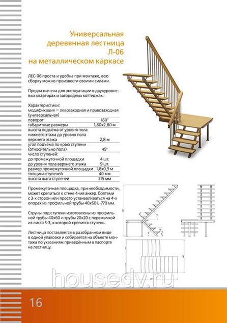 модификация левозаходная и правозаходная (универсальная) поворот 180° габаритные размеры 1,80 х 2,80 м высота подъёма от уровня пола нижнего этажа до уровня пола верхнего этажа 2800 мм угол подъёма по краю ступени относительно пола 45° число ступеней: до промежуточной площадки 4 шт до уровня пола верхнего этажа 9 шт размер промежуточной площадки (со ступенью) 1,8 х 0,9 м толщина ступеней 40 мм высота шага ступеней 215 мм