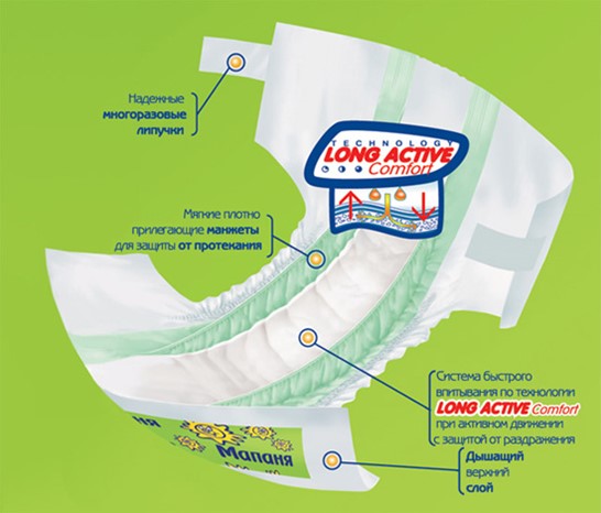 Больше движения новая структура подгузника позволяет при активном движении сохранять кожу малыша сухой и чистой. Больше впитываемость новая система распределения жидкости по всей поверхности впитывающего слоя существенно увеличивает время использования подгузника. Отсутствие раздражения специальные не впитывающий материал при прохождении жидкости создает прослойку воздуха, отделяющую сухой верхний слой и внутренний впитывающий слой. Защита от протекания дополнительный слой защищает от протекания и еще больше увеличивает объем впитывания. Быстрое впитывание жидкость моментально проходит через верхний слой подгузника.
