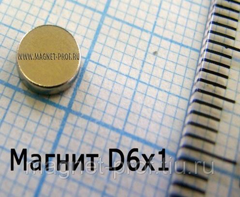 Неодимовый (NdFeB) магнит D6x1мм. (диаметр 6мм, толщина 1мм.) имеет маленький размер и большую магнитную силу. Не смотря на свой маленький размер этот магнит, имеет на поверхности остаточную индукцию более 160 мТл, и усилие отрыва около 350 грамм.. Магнит 6х1 часто используют в сувенирах, поделках, игрушках, бижутерии, а также в радиоэлектронных приборах. Он способен удержать сувенир из гипса, картона, стекла и т.д. весом не более 30 грамм.