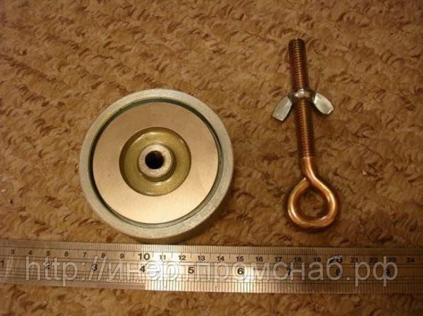 Поисковый магнит предназначен для подъема ферромагнитных (металлических) фрагментов из колодцев, провалов, водоемов и т. д., а также может пригодиться в рыхлых грунтах для извлечения мелких железных фрагментов. Конструкция: