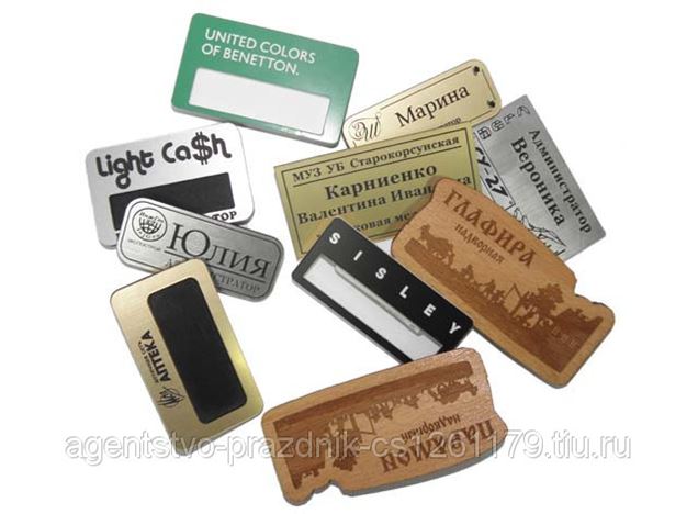 Бейджи пластиковые, деревянные, заливные. Размер от 16 до 50 кв.см , незначительные изменения размеров на цену не влияют. Крепление -магнит. Цена от 80 до 150.