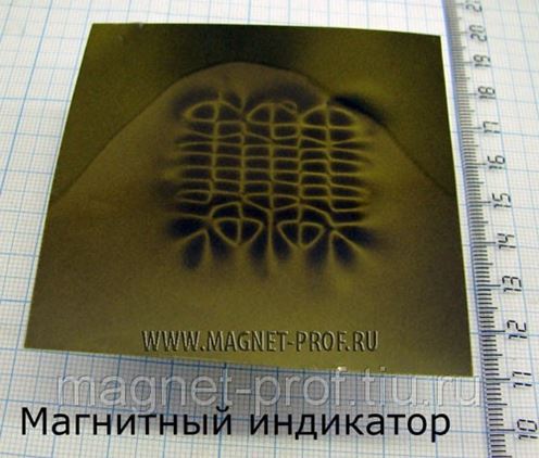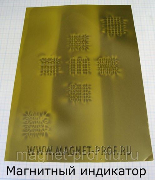 Магнитный индикатор (Flux-Детектор, магнитный детектор) делает магнитное поле видимым. Магнитный индикатор представляет из себя пленку с металлическими частичками в желеобразной суспензии. Магнитный индикатор окрашивается в темные тона, когда магнитное поле направлено под прямым углом к пленке (вблизи полюсов) и светлеет, когда направление магнитного поля параллельно пленке или его нет.