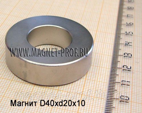 Неодимовый магнит – кольцо 40х20х10мм. (наружный диаметр 40мм., внутренний диаметр 20мм., высота 10мм.) Магнит D405xd20x10мм. сделан из редкоземельного металла неодим-железо-бор (Nd-Fe-B) и обладает хорошими магнитными свойствами. Кольцевой магнит D40хd20хh10 имеет антикоррозийное покрытие из никеля.