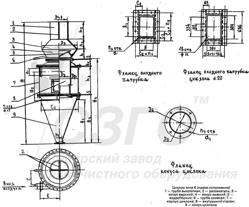 Циклоны типа К устанавливаются на нагнетательных участках систем пневмотранспорта. Циклоны могут быть правого и левого исполнения. Номер циклона обозначается числом, равным диаметру корпуса циклона, выраженному в дециметрах.