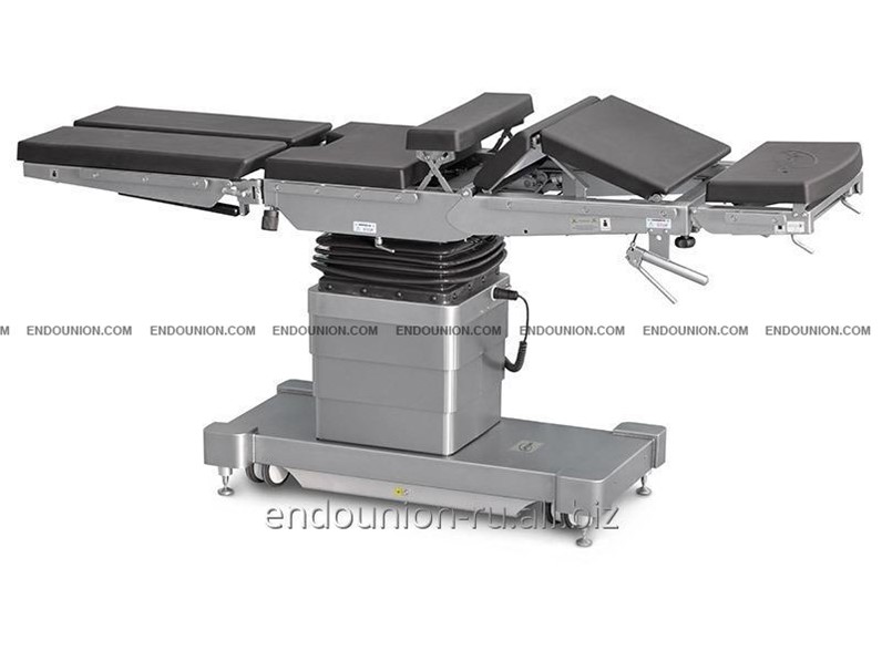 Электрогидравлический привод на 6 позиций с управлением от ручного пульта позволяет осуществлять продольные и боковые наклоны, подъем панели стола до необходимого уровня, производить наклоны спинной секции, подъем встроенного почечного валика или подъем двухсекционной спинной секции. Перевод стола из транспортного положения в рабочее (зафиксированное) и обратно осуществляется одной из шести кнопок ручного пульта. Имеется сдвиг панели в продольном направлении на 320 мм. Головная и ножные секции на пневмопружинах. Стол имеет батарейное питание с индикатором уровня заряда на 48 часов рабочего времени.